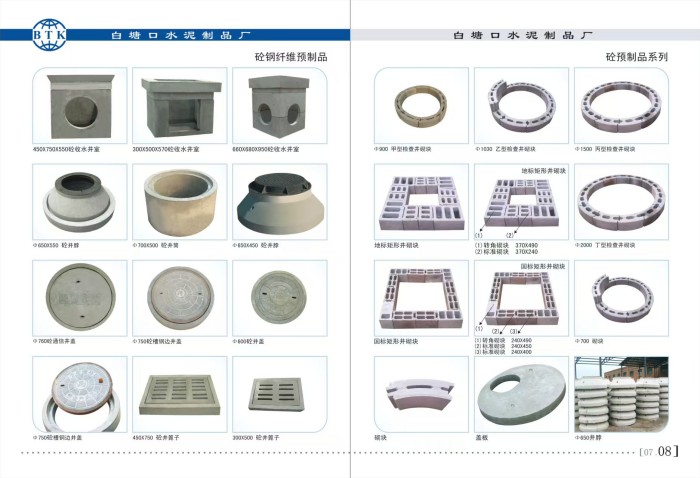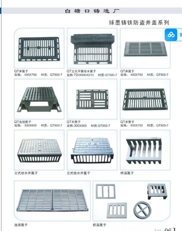 天津市津南白塘口铸造厂,座落在天津市静海经济开发区北区2号路8门。自86年建厂,主要产品有:1、城市道路各种铸铁井盖、井箅子等2、砼砌块、砼井脖、砼井体等3、复合树脂井盖、井箅子等,适用于市政排水、自来水、中水、电力、燃气、电信、热力、消防等工程。